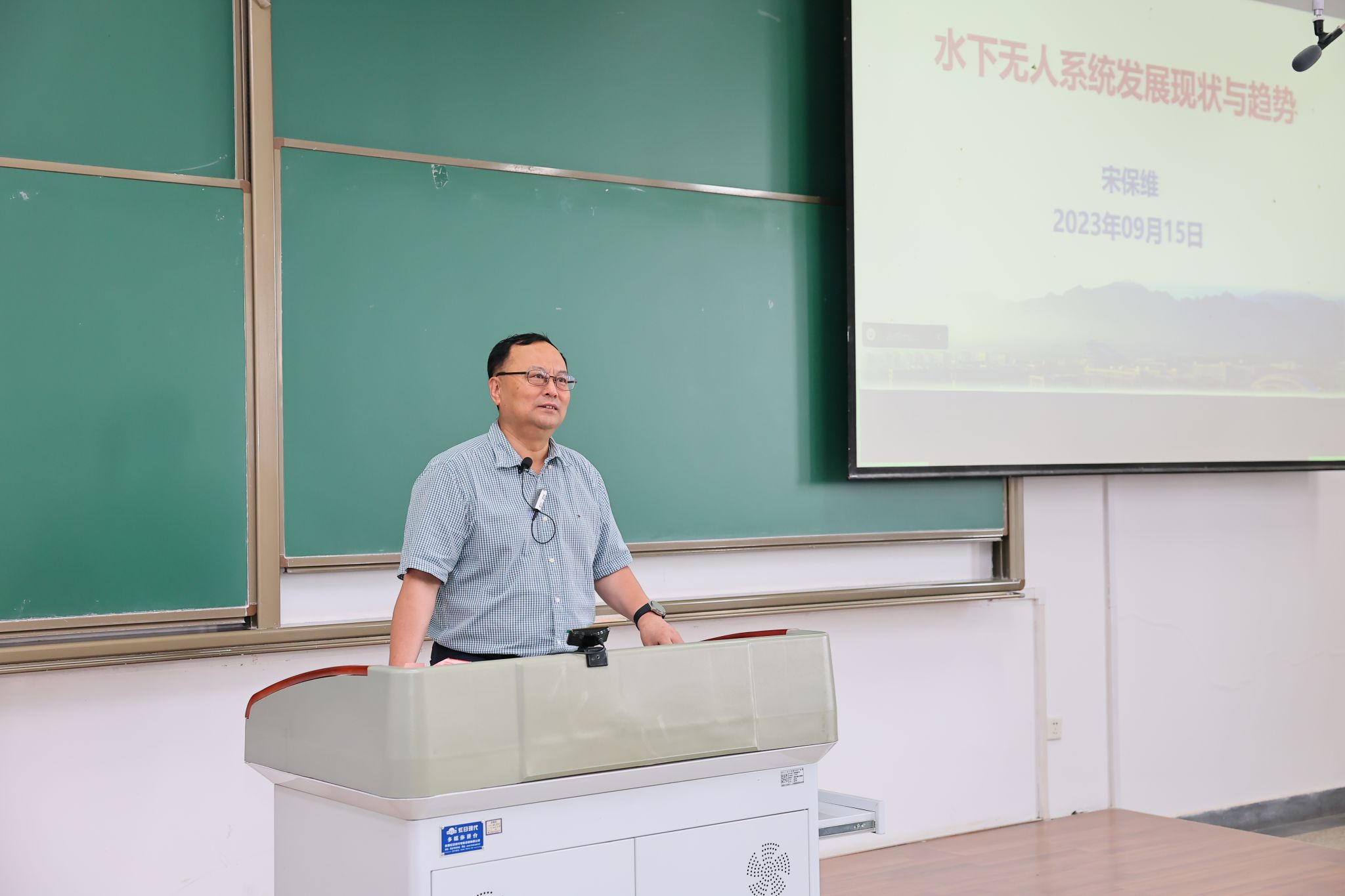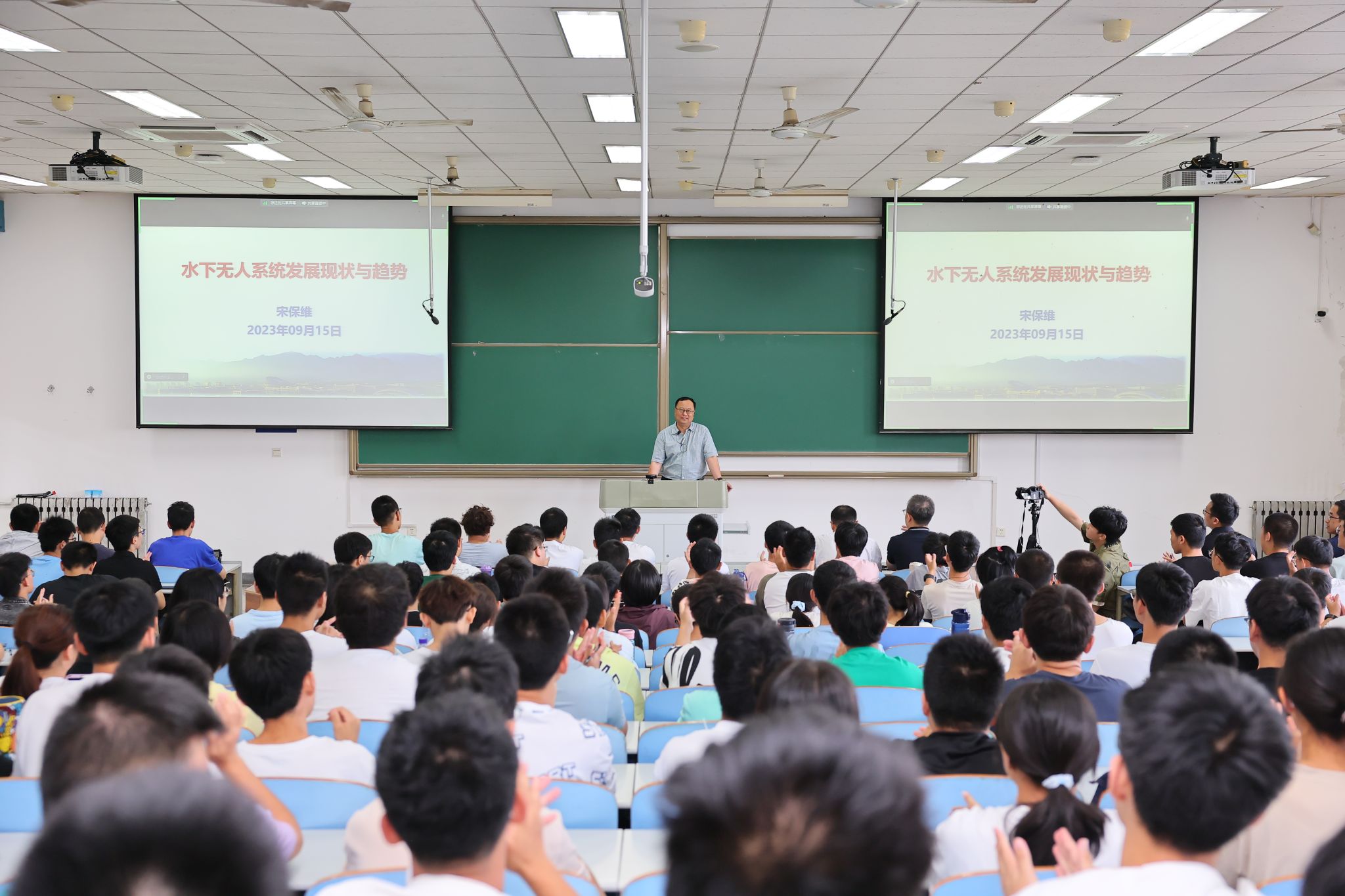 课堂中,宋校长从水下无人系统的定义与作用、水下无人系统的发展现状、水下无人系统的典型应用、自主水下航行器技术发展四个方面展开,全面详实地介绍了水下无人系统状况,为新生学子们带来一场精彩的学术盛宴。