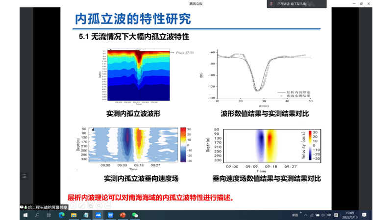 王战博士后从海洋中常见的海啸、南海“水下断崖”问题和相关文献介绍了内孤立波的研究背景及意义;接下来从层析水波理论的控制方程和边界条件证明了层析水波理论封闭可解,同时介绍了背景剪切流的初始条件;再针对孤立波的特性研究,依次介绍了无流情况下大幅孤立波特性,层析水波结果与欧拉解的波形和速度剖面对比、线性背景剪切流中的孤立波特性,顺流和逆流方向波速与压强的对比、非线性背景剪切流中的孤立波特性,不同次数多项式下波速与波形的对比;同时提出了对于多层流体下的层析内波理论,对比层析水波理论,每层流体质点的速度沿竖直方向以不同次数多项式变化,同时根据控制方程和边界条件证明了层析内波理论封闭可解;随后展开了内孤立波的特性研究,探究了线性背景流的内孤立波传播特性,以具体实验数据作为参照,进行波形和速度剖面对比,说明了层析内波的普适性,再探究海底地形变化以及线性背景和海底地形变化共同作用下的内孤立波传播特性,对比不同流强的波形和与波速的关系;对于三层流体,开展第一模态和第二模态的造波实验,证明层析内波理论波形和实验值吻合良好;最后对未来层析内波理论与DJL模型和CFD方法相结合进行展望,有望做出更加深入的研究。