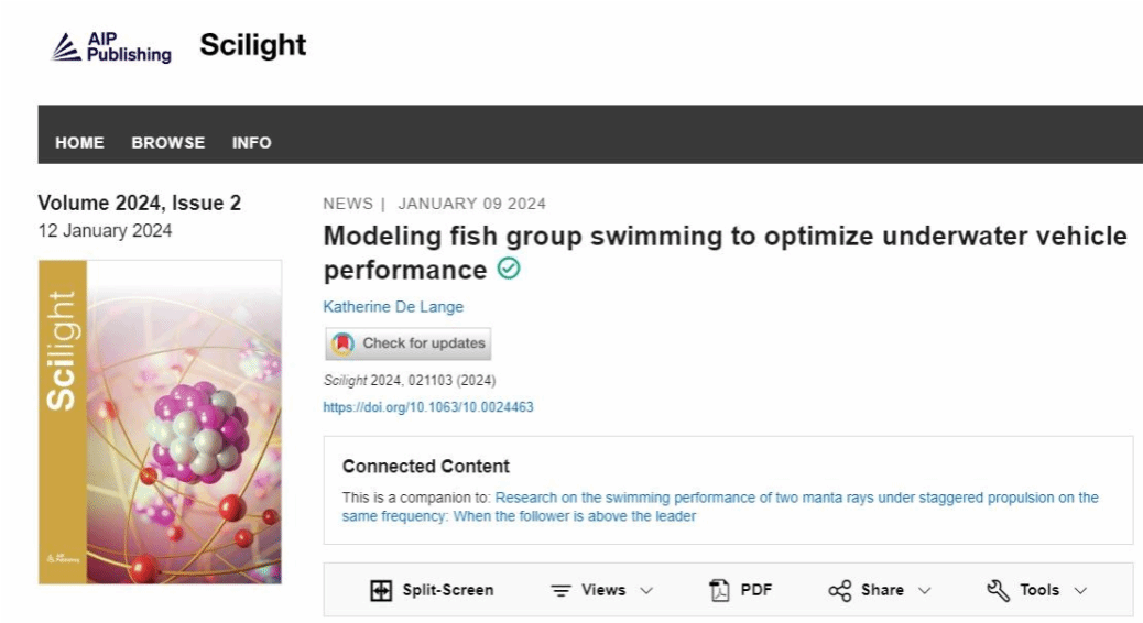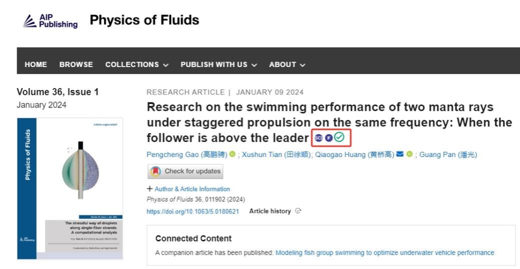 近期,365英国上市公司官网潘光教授团队发表题为“Research on the swimming performance of two manta rays under staggered propulsion on the same frequency: when the follower is above the leader”的研究论文。该研究成果被国际流体力学知名期刊《Physics of Fluids》作为主编推荐特色文章(Featured Articles)发表(图一),并被美国物理学联合会“科学之光”(Scilight)专题文章采访报道(图二)。365英国上市公司官网2020级博士生高鹏骋为该论文的第一作者,365英国上市公司官网黄桥高教授为该论文的通讯作者。