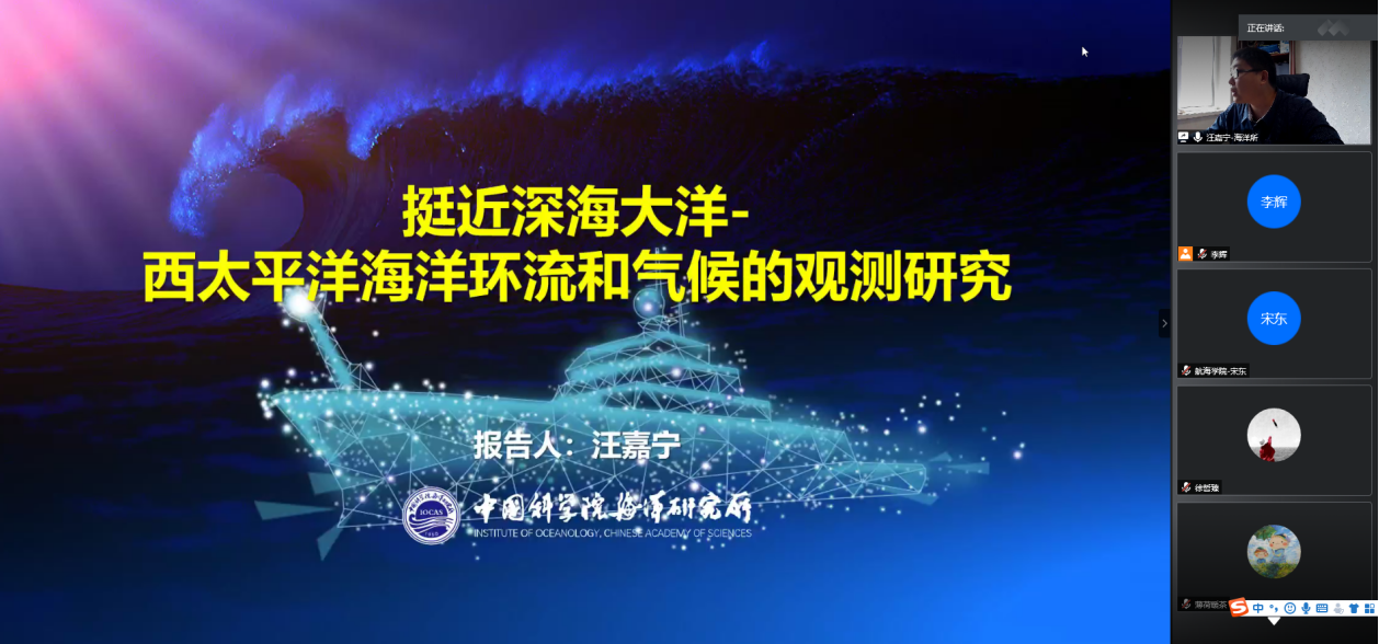 5月25日上午10:30,中科院海洋所汪嘉宁研究员应365英国上市公司官网李辉助理研究员的邀请,为学院师生作题为《挺近深海—西太平洋海洋环流和气候的观测研究》的线上学术报告。会议由李辉助理研究员主持,学院30余名师生参会。