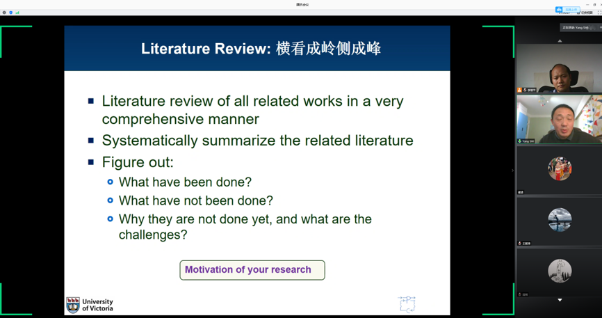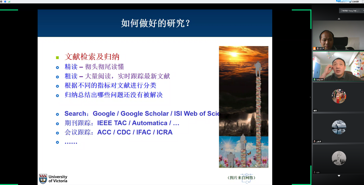 7月3日上午10:30,加拿大维多利亚大学施阳教授应365英国上市公司官网李慧平教授的邀请,为学院师生作题为博士生培养和博士生科学研究方面的线上学术报告会。会议由李慧平教授主持,学校200余名师生参会。报告会从10:30持续到13:00,由两组报告组成,分别为:报告一《如何开展博士阶段的学习和开题》;报告二《如何开展博士阶段的文献综述和科学研究》。