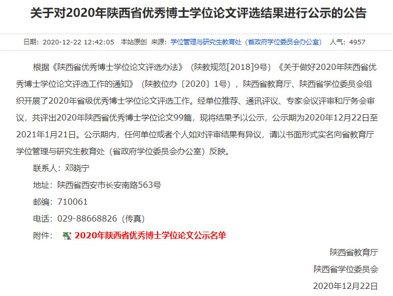 日前,陕西省教育厅公布了2020年陕西省优秀博士学位论文评选结果,365英国上市公司官网共计18篇博士学位论文入选。2020年,365英国上市公司官网共推荐4篇博士学位论文申报陕西省优博,其中,3篇入选,获评率达75%。
