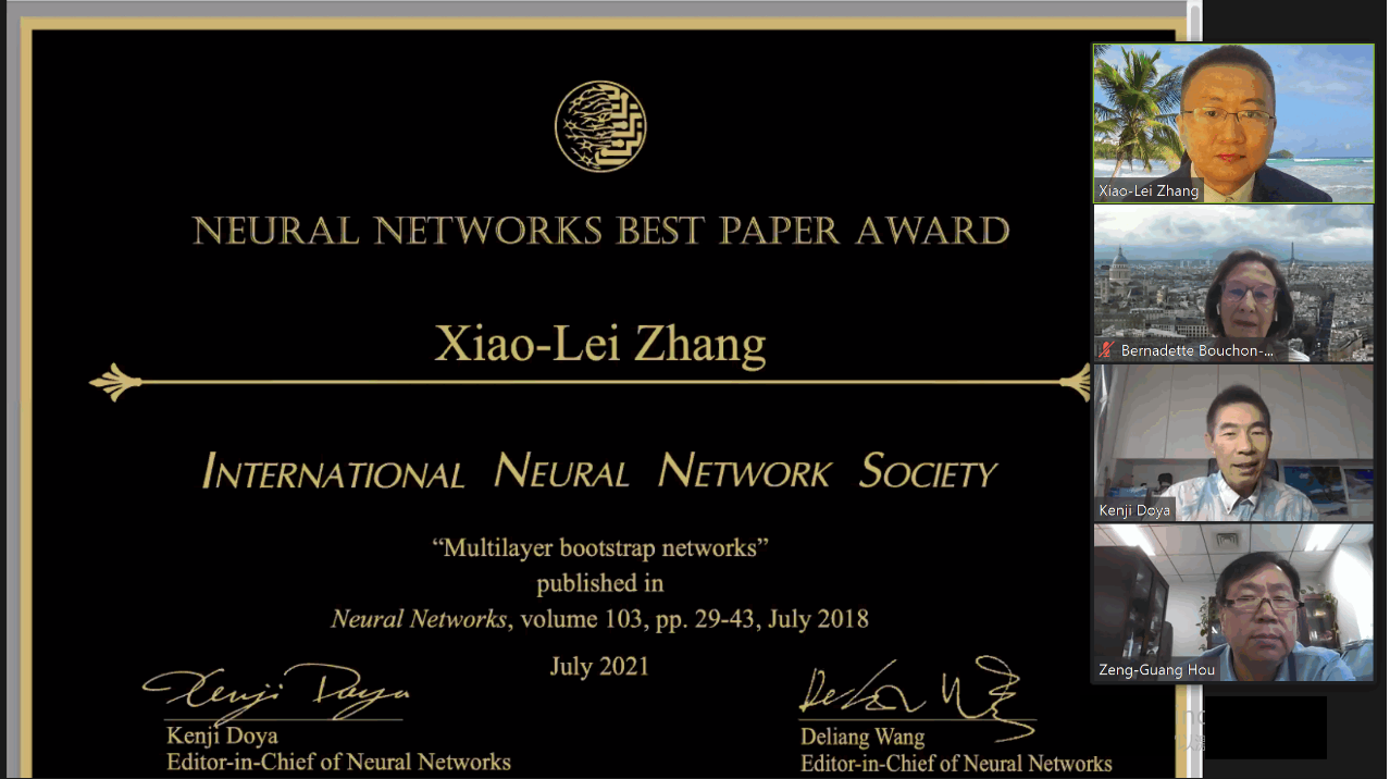 作为国际神经网络学会最重要的奖项之一,最佳论文奖的颁奖仪式于2021年7月22日在国际神经网络联合会议上举行(在线会议)。张晓雷教授作为该论文的唯一作者接受了《Neural Networks》共同主编DeLiang Wang教授和Kenji Doya教授、及国际神经网络学会主席Chrisina Jayne教授的联合授奖,以表彰该工作在人工智能与神经网络研究上的突出贡献。