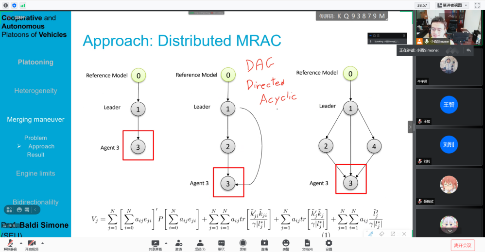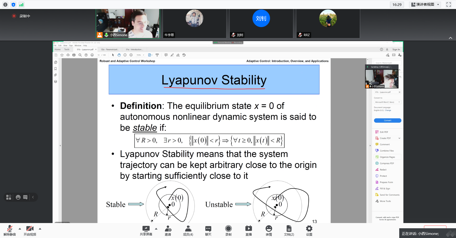 7月19日- 7月29日,应365英国上市公司官网李乐老师邀请,荷兰代尔夫特理工大学Simone Baldi老师于线上开展自适应控制及应用课程,选课学生一共16人,其中2名本科生,14名研究生,本课程一共16学时,主要讲授自适应控制理论及其应用。介绍自适应控制系统分析和设计的基本理论和方法,包括前期知识,模型参考自适应控制、鲁棒自适应控制、自适应切换控制等;并结合实例介绍自适应控制在无人机路径跟踪、无人车编队保持等无人系统控制问题中的应用。