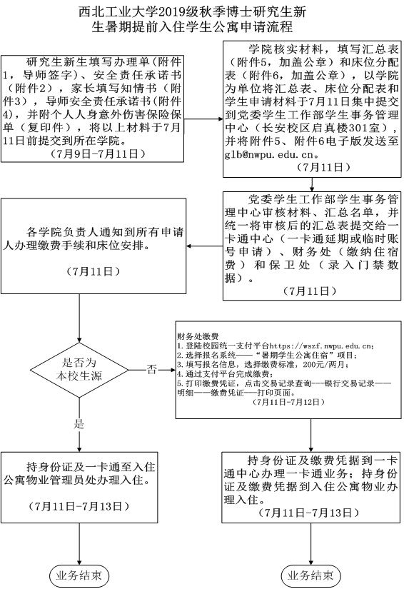 2.请各学院完成需提前入住的2019级秋季博士研究生新生的具体住宿床位分配,完成床位分配表(附件6)填写。请于7月11日10:00前将床位分配表(附件6)电子版发送至学生事务管理中心邮箱glb@nwpu.edu.cn,纸质版(分管学生工作的学院领导签字,加盖学院公章)提交至党委学生工作部学生事务管理中心(长安校区启真楼301室)。
