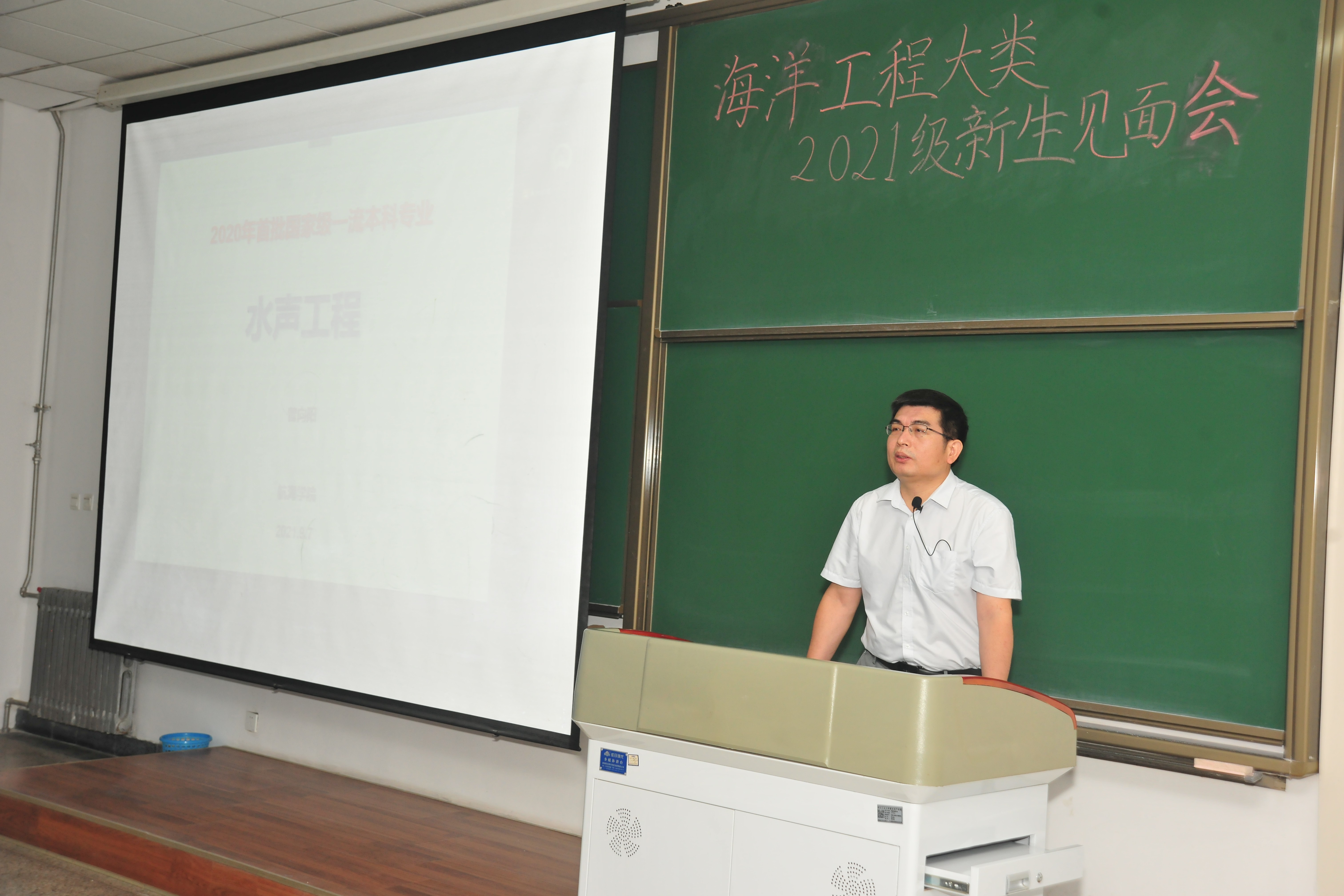 随后,专业负责人分别做专业介绍。船舶与海洋工程专业负责人胡海豹教授、水声工程专业负责人曾向阳教授、信息工程专业负责人张群飞教授分别从专业概况、师资队伍、教学团队、科研获奖、人才培养、就业发展等方面全方位介绍了本专业,让同学们对学院的专业设置有所了解,为将来分专业做好准备。最后,三位负责人向新生同学们表示欢迎,365英国上市公司官网温暖大家庭将为同学们的专业学习提供一切帮助。