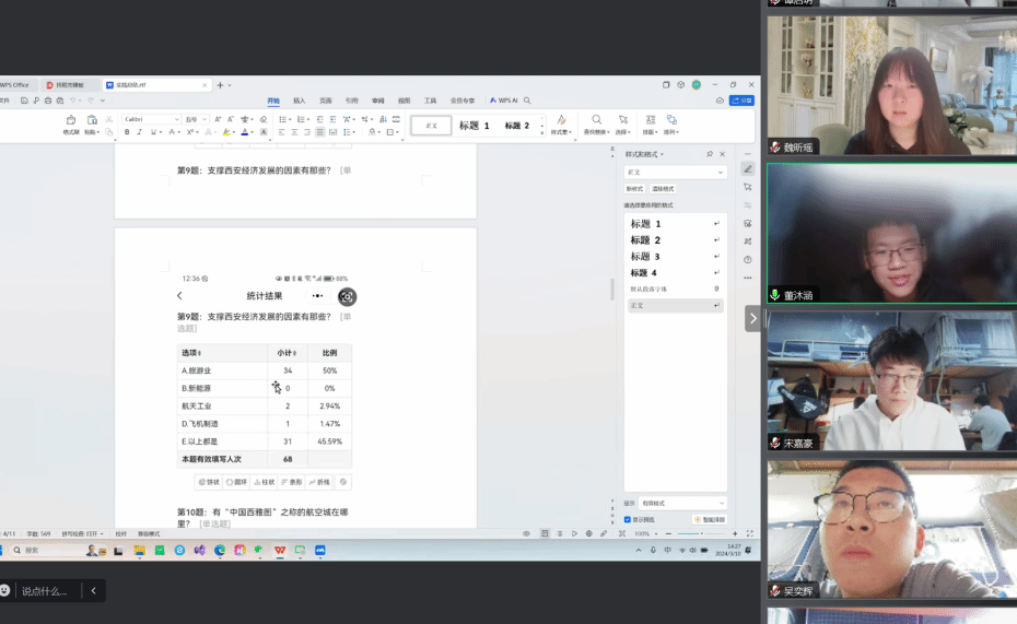 2024年2月24日,在班主任赵老师的指导和队长庞景文的主持下,同学们对本次实践活动进行了复盘与总结。在会议中,大家对整个活动过程进行回顾与反思,并从中吸取经验教训,为今后的活动提供参考和借鉴。负责前期宣传任务的周顺明同学表示,由于学生在寒假期间仍然有繁重的复习备考任务,没有多余精力关注活动通知,也很难有效参加宣讲活动,以后此类活动可以加强在学生家长中的宣传,提高宣讲活动的参与度。负责西工大知名度问卷调查的董沐涵同学总结了问卷的设计工作与结果分析。问卷结果显示,学生与家长对西工大“总师育人文化”以及西安在航空航天特色产业的就业优势了解仍然不足,建议作为未来招生宣讲的重点内容。