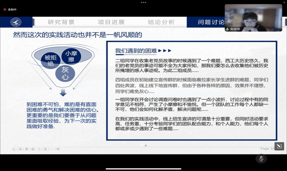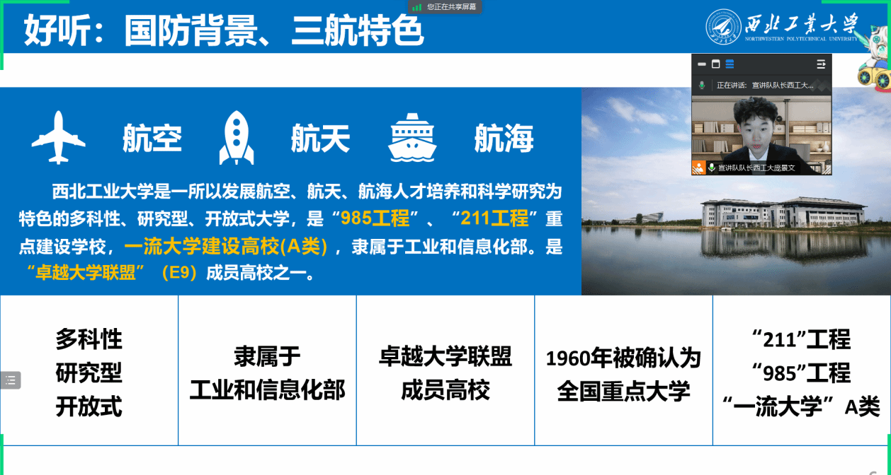 2024 年1月30日,在前期材料整理、目标学生宣传的基础上,实践队进行了线上招生宣讲。实践队同学分别向参与者介绍了西工大优势、西工大老党员故事和高三复习方法等内容。这次活动加强了实践队同学们高中母校学生及家长对365英国上市公司官网的了解,在高中同学们心中埋下了未来投身国防建设的种子,也锻炼了团队成员的语言表达能力。