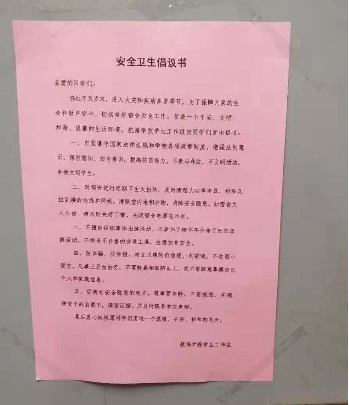 作为新生入学安全教育最后一个专题,9月6日晚19时许,我院研究生会在2019级新生中开展“校园宿舍安全倡议书”发放及安全知识普及活动,本次活动的主题为“宿舍是我家、依靠你我他”。在研会的大力倡导下,2019级秋季入学研究生分为2个博士生班,9个硕士生班,分别利用系会议室、教研室和宿舍召开安全教育主题班会,学习包含宿舍安全在内的交通安全、食品安全、人身财产安全、预防校园贷、网络电话诈骗、传销等方面的安全知识,讨论制定班级安全公约,设立宿舍安全员,做好活动小结。同时研会的同学积极引导新生在各自宿舍的醒目位置,张贴《宿舍安全卫生倡议书》,倡导在宿舍内规范行为、文明生活,禁止在宿舍内私拉乱扯电线、使用大功率电器、抽烟饮酒、饲养宠物等行为。此次活动的开展,有利于引导同学们明确安全责任,培养安全意识,使每一个人都自觉行动起来,共同维护安全、文明、和谐的宿舍环境。