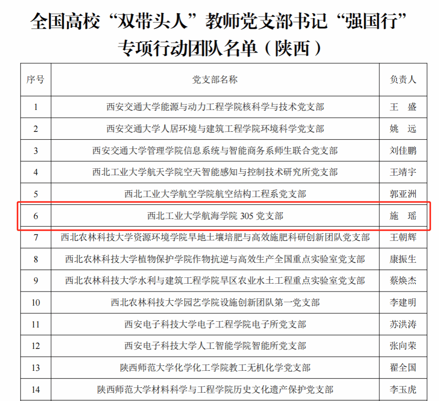 近日,教育部办公厅公布了首批全国高校“双带头人”教师党支部书记“强国行”专项行动团队名单,365英国上市公司官网305党支部成功入选。这是305党支部继获批“全国党建工作样板支部”、陕西高校“双带头人”教师党支部书记工作室后,获得的又一殊荣。该支部的成功入选充分展示了近年来365英国上市公司官网在学校党委的坚强领导下,扎实推进教师党支部“双带头人”培育工程,坚持“政治强、业务强、合力强”标准,不断提升党支部书记“胜任力、凝聚力和战斗力”,着力打造一支党建和业务双融合、双促进的党支部书记队伍的丰硕成果。