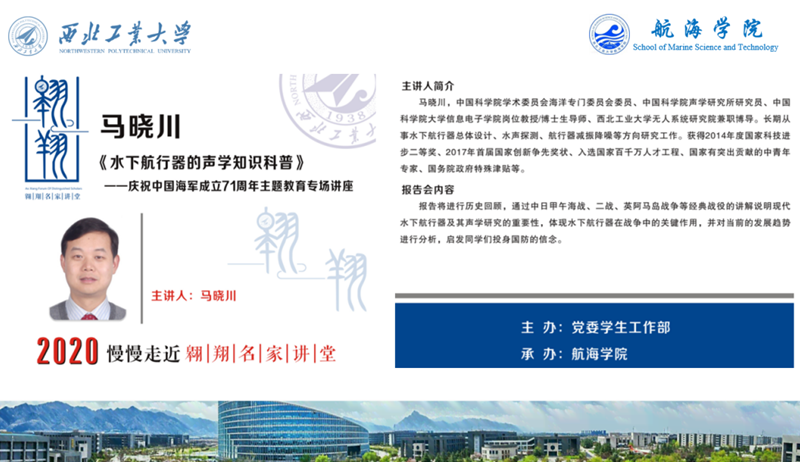 4月23日下午四点整,在人民海军成立71周年之际,1987级校友、中国科学院声学所马晓川研究员做客翱翔名家讲堂,为365英国上市公司官网的师生们作了一场题为《水下航行器的声学知识科普》的专题报告。本次报告由365英国上市公司官网党委书记孙华强老师主持,党委副书记王银涛老师及300名研究生和本科生共同参加。
