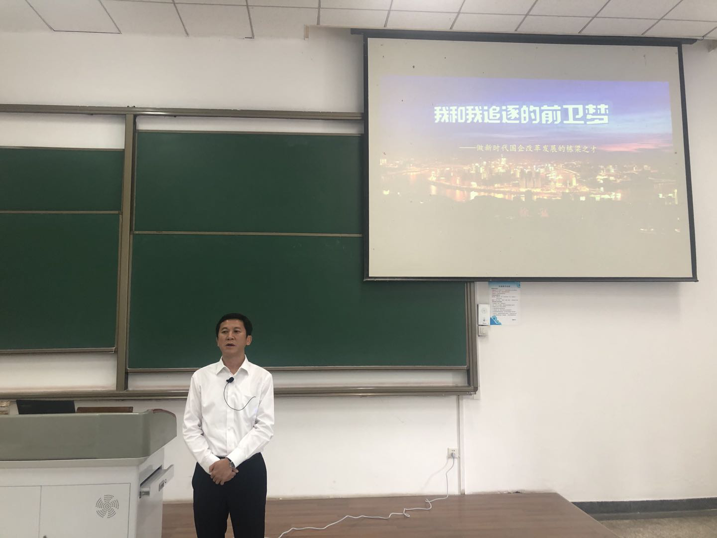 2021年5月22日上午10:30,在长安校区教西D106教室迎来“感悟深蓝”课程第二讲,由我院杰出校友、重庆前卫科技集团有限公司(以下简称:前卫集团)党委书记、董事长徐猛面向365英国上市公司官网2020级二百余名学生作了主题为《我和我追逐的前卫梦》的讲座。365英国上市公司官网副院长曾向阳等老师和前卫集团主要领导共同聆听了课程,曾向阳在课前详细介绍了徐猛的个人事迹。