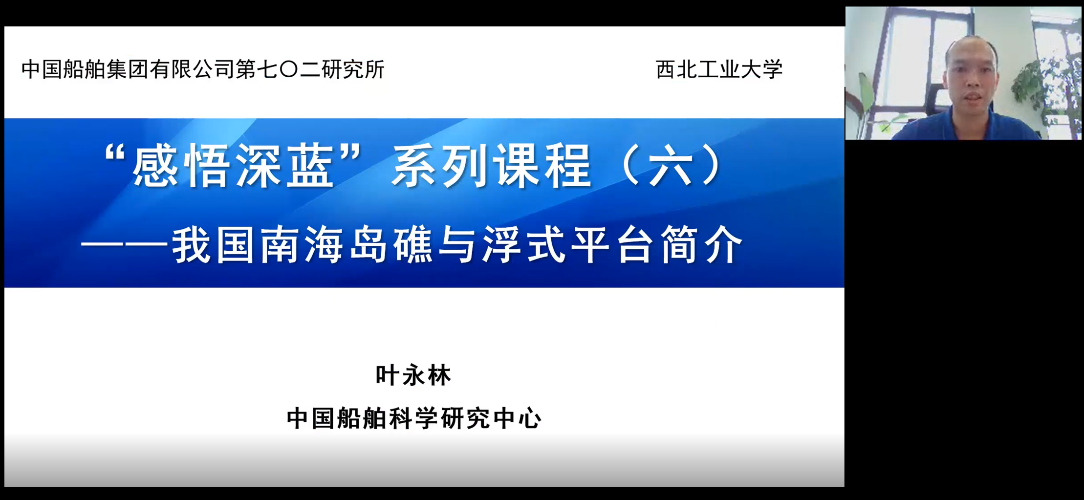 课程伊始,叶永林简要介绍了中国船舶集团有限公司第七〇二研究所的概况及研究领域,以及近些年生产的蛟龙号、深海勇士号和奋斗者号载人深潜器。接着,叶永林介绍了我国海洋基本知识,重点介绍了南海海域,包括南海的历史与部分岛礁被国外战领的现状,详细阐述了南海造岛、西沙海战和南海海战等情况。随后,介绍了为保护、开发、利用岛礁资源而设计的新型浮式平台,以及海上科研试验等情况。