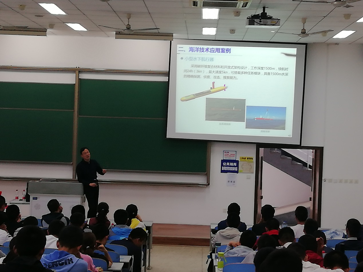 随后,潘院长给同学们分享了现今最有代表性的海洋技术应用案例,讲述水下声学技术、水下光学技术、海洋遥感技术、潜水器技术、海洋试验技术、海洋装备设计与集成技术、海底观测网络、水下采样技术等多种海洋技术。第一次接触到这些从未涉猎的领域,同学们都不禁赞叹现今世界海洋技术的发展之迅猛。潘院长的讲述为新生们确立学习方向提供了很好的参考意见,让大家进一步深入了解了自己即将要学习的专业。