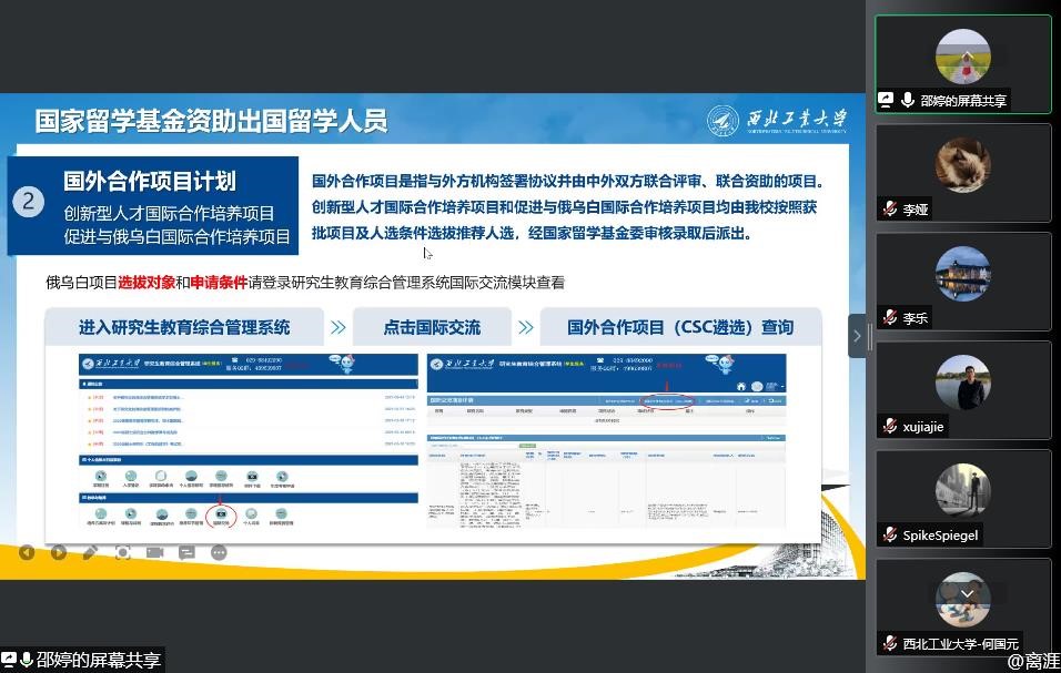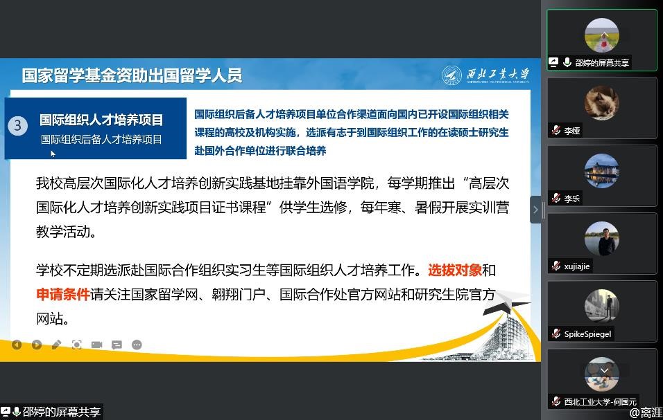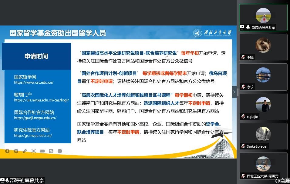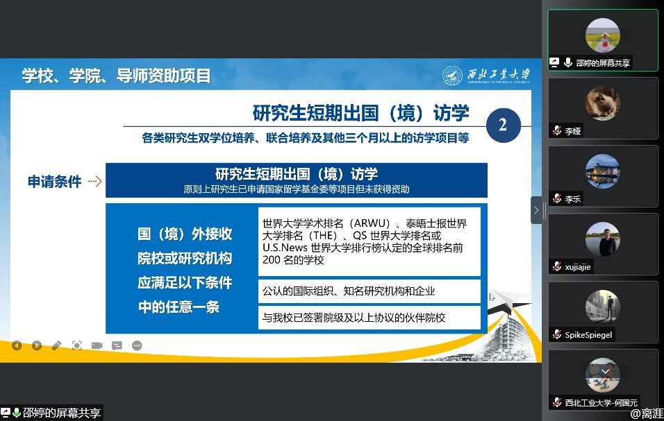 随后,邵婷从四个方面介绍了365英国上市公司官网赴国(境)外交流项目情况,鼓励同学关注相关微信公众号、官方网站等发布渠道以及学院相关通知,第一时间了解项目信息。同时,从研究生短期出国(境)访学、联合培养等项目介绍了学校、学院、导师资助项目,以研究生赴国(境)外流程为例,介绍了相关流程,并提醒各位同学,外语水平等相关证明资料要早做准备,以免耽误申请。鼓励同学们多多申报,主动跟导师、同学、学院沟通,提高自己的综合能力。学院会在经费支持、项目申报等方面提供帮助,助力同学申报成功。