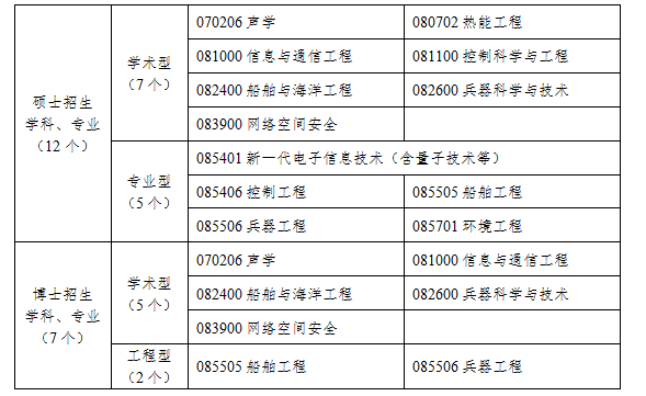 现有兵器科学与技术、船舶与海洋工程、信息与通信工程、网络空间安全4个一级学科博士授权点和声学1个二级学科博士学位授权点,其中武器系统与运用工程(现为“兵器科学与技术”)与水声工程(现为“船舶与海洋工程”)是国家重点学科。